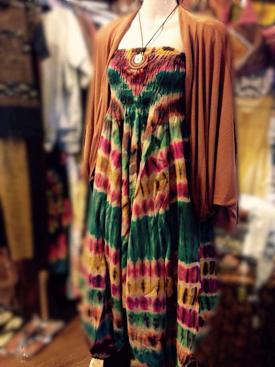 久しぶりに仕入れした コットンのタイダイ グラデーションのパンピース、軽くて合わせやすいです。